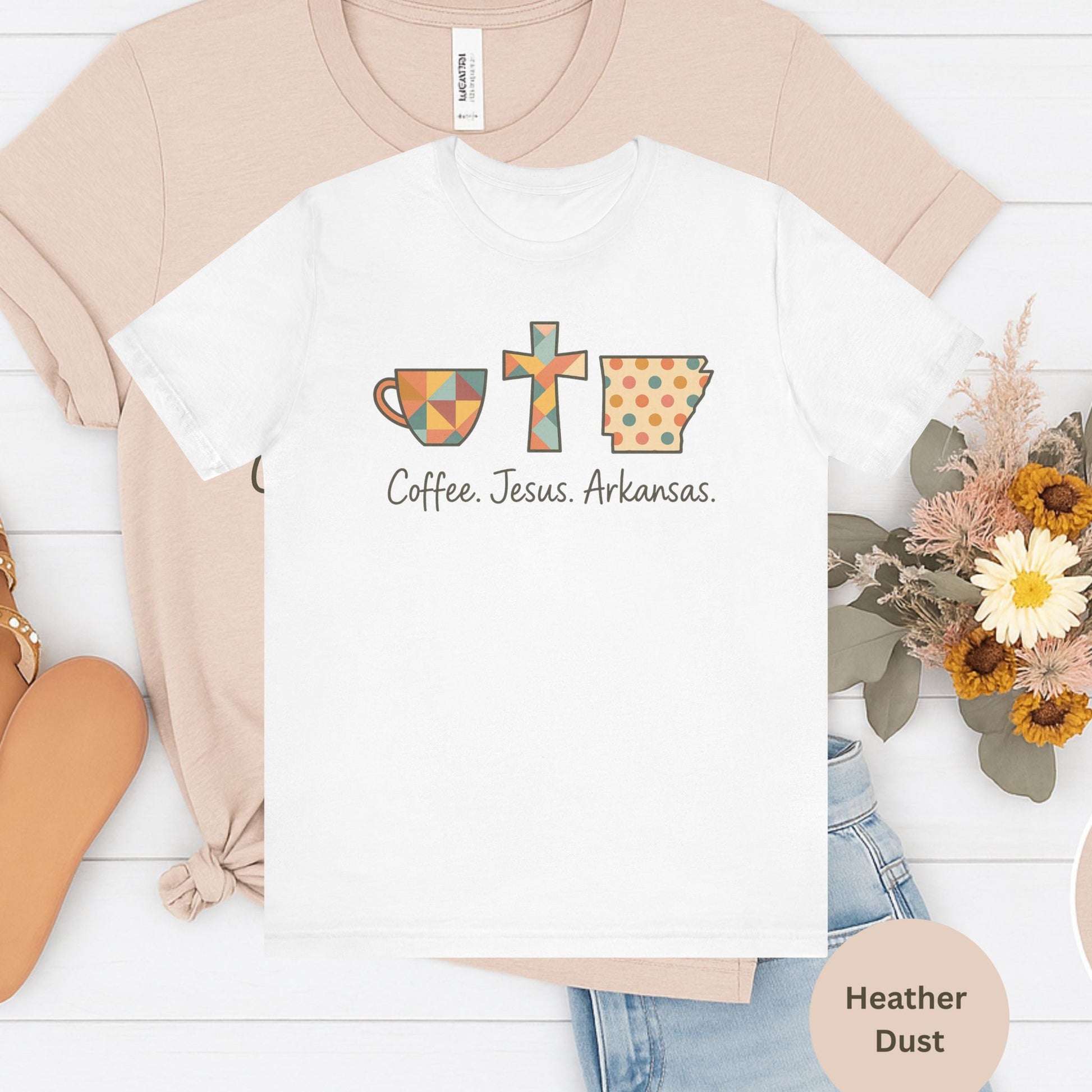 Start your day with purpose and pride in this charming “Coffee. Jesus. Arkansas.” graphic tee! Featuring a warm and whimsical design of a geometric coffee cup, bold cross, and polka-dot Arkansas state outline in soft, retro hues, this shirt blends faith, comfort, and Southern roots perfectly. Whether you’re sipping your morning brew, heading to Sunday service, or repping your Arkansas pride, this cozy tee makes a stylish faith statement.